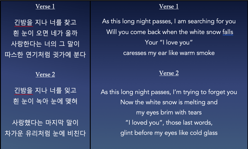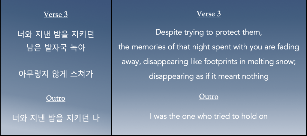 Side Note: I took the liberty in my translation of taking the phrase “너와 지낸 밤을” (literally “the night spent with you”) to also signify the past memories of their relationship as well as it could be referring to the last night that they saw each other.